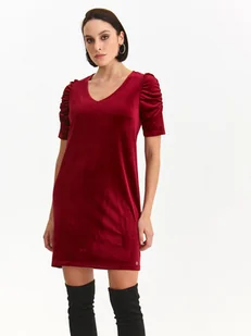 Sukienka damska Top Secret z marszczonymi bufiastymi rękawami. Elegancka sukienka damska o prostym kroju i długości do połowy uda. Posiada ona okazały dekolt w serek oraz efektowne marszczenie z przeplotem w górnej części pleców wraz z rozcięciem w formie łezki. Jest ona wykonana z delikatnej oraz przyjemnej w dotyku dzianiny z niewielkim połyskiem, a uroku dodają jej krótkie bufiaste rękawy z marszczeniem na całości. Sprawdzi się ona świetnie w przeróżnych kobiecych stylizacjach oficjalnych i wyjściowych.