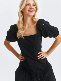 Sukienka damska Top Secret z krótkimi bufiastymi rękawami. Elegancka mini sukienka damska w wersji taliowanej, która przylega do kobiecej sylwetki i eksponuje jej walory. Posiada ona efektowny kwadratowy dekolt oraz odsłoniętą górną część pleców, będąc zapinaną z tyłu na chowany suwak. Uroku dodają jej krótkie bufiaste rękawy zakończone gumką oraz okazała falbana u jej dołu. Wykonana ona została z przyjemnej w dotyku oraz trwałej bawełny, będąc wzbogaconą o ozdobne ażurowe wstawki na całości.