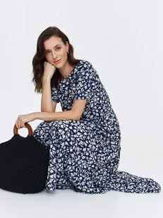 Sukienka damska Top Secret z efektownym kwiatowym nadrukiem. Ujmująca swym niecodziennym stylem długa sukienka damska o bardzo luźnym kroju z wieloma możliwościami praktycznego zastosowania. Posiada ona krótkie bufiaste rękawy zakończone luźną gumką oraz efektowny okrągły dekolt z ozdobną lamówką wokół, a uroku dodaje jej okazała falbana umiejscowiona u jej dołu oraz wiązanie w talii z wykorzystaniem szarfy z tego samego materiału, podkreślające smukłość kobiecej sylwetki. Uszyta ona została z delikatnej oraz przyjemnej w dotyku dzianiny wiskozowej, wzbogaconej na całości kwiatowym nadrukiem. Sukienka dostępna w kolorze granatowym SSU4740GR.