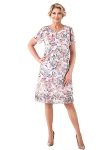Zachwycająco lekka i kobieca wielokolorowa sukienka w kwiaty to doskonały wybór na cieplejsze dni i wyjątkowe okazje. Utrzymana w subtelnej palecie barw od różu, fioletu i jasnozieleni po delikatne odcienie jeansu, ecru i pomarańczu wprowadza romantyczny klimat i świeżość do każdej stylizacji. Jej trapezowy fason zapewnia wygodę i swobodę ruchów, a okrągły dekolt i krótkie rękawy czynią ją idealną na wiosnę i lato. Całość wykonana z przewiewnego, niegniotącego się szyfonu prezentuje się niezwykle elegancko. Dół sukienki wykończony plisami dodaje jej lekkości i subtelnej dekoracyjności.