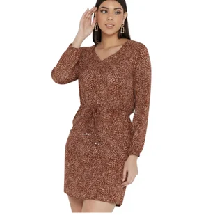 Sukienka w ciepłym, ceglastym odcieniu brązu została ozdobiona delikatnym, gęstym wzorem typu "nature print", który nadaje jej lekkości i sprawia, że jest niezwykle twarzowa. Dlaczego warto wybrać sukienkę Only? Elegancki dekolt V-neck: Dekolt w szpic optycznie wysmukla szyję i subtelnie eksponuje linię obojczyków. Komfort noszenia: Sukienka posiada wewnętrzną podszewkę, która zapewnia pełną dyskrecję, zapobiega prześwitywaniu materiału i sprawia, że tkanina idealnie układa się na ciele.