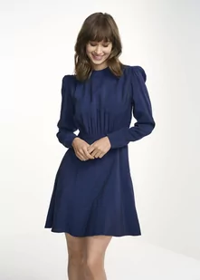 Sukienka damska w kolorze granatowym. Długie, bufiaste rękawy, stójka przy dekolcie oraz rozkloszowany dół sprawia, że model prezentuje się wyjątkowo i dziewczęco. Fantastycznie sprawdzi się w wielu codziennych stylizacjach. kolor granatowy krój rozkloszowany rękawy długie, mankiety zapinane na guzik dekolt ze stójką marszczenie w talii model wkładany przez głowę z zapięciem z tyłu, przy szyi długość przed kolano Nasza modelka ma 172 cm wzrostu i nosi rozmiar XS. Skład: 90% wiskoza, 10% poliester