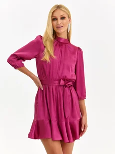 Sukienka damska Top Secret z kołnierzykiem na stójce. Ujmująca elegancją sukienka damska o prostym luźnym kroju z bufiastymi rękawami o długości za łokieć zakończonymi gumką. Posiada ona efektowny kołnierzyk na stójce i jest zapinana z tyłu na guziczki, a uroku dodaje jej delikatne marszczenie z przodu. Ma ona praktyczny pasek z tego samego materiału do przewiązywania w talii oraz okazałą falbanę u jej dołu, dodającą jej zwiewności i frywolności. Została ona wykonana z delikatnej oraz przyjemnej w dotyku i lekko połyskującej dzianiny, będąc doskonałym wyborem na wszelkiego rodzaju stylizacje imprezowe.