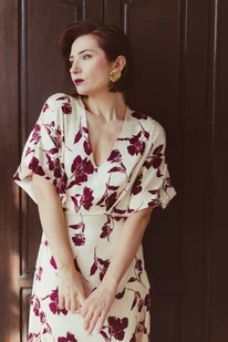 Sukienka midi w odcieniu kremowym z bordowym, roślinnym wzorem. Wykonana z lekkiego materiału, który delikatnie układa się na sylwetce. Luźne rękawy o długości 3/4 oraz subtelne marszczenie w talii nadają c ...