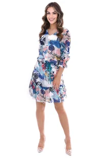 Sukienka o luźnym fasonie, uszyta z tkaniny szyfonowej . Dekolt okrągły. Rękaw z gumką i falbanką . Na dole sukienki szerokafalbana. Rękawy oraz dół wykończony mereżką.