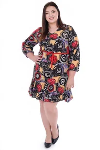 Prosta sukienka z rękawem 3/4, lekko dopasowana. Dół sukienki wykończony jednąfalbanką, a rękawki na dole lekko umarszczone gumką. Sukienka nie posiada rozpięcia , ale ze względu na elastyczność materiału i dekolt nie ma problemu przy zakładaniu. Fason sukienki jak i dekolt w serek wysmukla sylwetkę. Uszyta jest z różnokolorowych materiałów w fajne ciekawe printy.