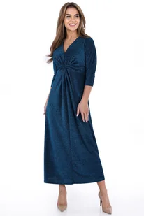 Dłuższa sukienka z fantazyjnym supełkiem pod biustem , marszczeniem oraz wiązaniem z tyłu. Rękaw jest wąski i długość 7/8. Sprawdzi się idealnie dla każdej sylwetki Sukienka dziękimarszczeniu i naddającej siędzianiniedopasowuje się do sylwetki. Sukienka na różne okazje świąteczne oraz wyjścia do teatru, opery. Skład surowcowy: