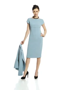 Klasyczna, dopasowana sukienka. Uszyta została z eleganckiej, stonowanej tkaniny. Jest to materiał stabilny, dlatego dobierając rozmiar należy uwzględnić kilka centymetrów luzu. Dekolt łódka. Rękaw krótki.