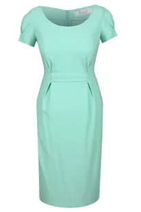 Klasyczna, dopasowana sukienka. Dekolt okrągły. Rękaw krótki, z ozdobnym marszczeniem. Ocięcie w talii, podkreślone paskiem. Na przodzie cięcia francuskie, zaakcentowane w pasie drobnymi kontrafałdami.