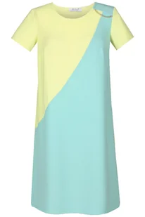 Sukienka w kształcie trapezu. Dopasowana jedynie w biuście, natomiast w pasie i biodrach luźna. Dekolt okrągły. Rękaw krótki. Przód oryginalnie zaprojektowany, z boku przy ramieniu ozdobny łańcuszek.