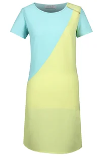 Sukienka w kształcie trapezu. Dopasowana jedynie w biuście, natomiast w pasie i biodrach luźna. Dekolt okrągły. Rękaw krótki. Przód oryginalnie zaprojektowany, z boku przy ramieniu ozdobny łańcuszek.