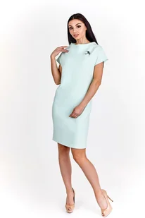 Ołówkowa sukienka, dopasowana jest w biodrach, natomiast w pasie oraz biuście luźna. Rękaw krótki, - kimono. Dekolt łódka, odstający na ramionach, tworzy kształt komina. Przy szyi znajduje się srebrna, dopinana broszka. Sukienka uszyta została z bardzo dobrej gatunkowo tkaniny.