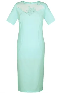 Klasyczna, ołówkowa sukienka. Dekolt okrągły wykończony lamówką. Na przodzie, karczek z koronki. Na bokach okrągłe cięcia, wyszczuplające sylwetkę. Rękaw krótki, typu reglan.