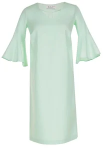 Sukienka z rozkloszowanym rękawem, układająca się w linię trapezu to propozycja dla pań, które lubią stonowane, klasyczne barwy, ale cenią sobie też nieszablonowe podejście do mody. Falbanka, jako zakończenie krótkiego rękawka, jest bardzo dziewczęca, ale nie infantylna, subtelnie odwróci uwagę od mocniej zbudowanych rąk. Kształt sukienki, układający się w linię A, zamaskuje zbyt obfite biodra, a paniom o figurze jabłka, optycznie je "stworzy". Dość luźny fason tej propozycji pozwoli czuć się i stylowo, i wygodnie. Uwagę zwraca tu też dekolt w literę V, który ładnie wydłuża szyję.
