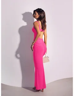 Sukienka maxi z odsłoniętymi plecami ELARA - neon róż Niezwykła i oryginalna . . . to pierwsze co przychodzi na myśl na widok tej sukienki! Poczuj się jak gwiazda wieczoru w naszej oszałamiającej maxi sukience Elara. Ta kreacja, lekko rozszerzająca się do dołu, z zabudowanym dekoltem i zmysłowo odsłoniętymi plecami, jest synonimem kobiecości i elegancji. Ramiączka dodają delikatności, podczas gdy marszczenia z tyłu fantastycznie modelują i podkreślają pośladki, oferując nieskazitelną sylwetkę. Elastyczny, lejący się materiał drapuje się idealnie, zapewniając zarówno komfort, jak i niepowtarzalny wygląd.