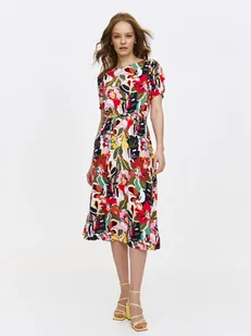 Sukienka damska Top Secret z barwnym kwiecistym nadrukiem. Sukienka damska o prostym luźnym kroju i długości za kolano. Posiada ona krótkie lekko bufiaste rękawy zakończone gumką oraz owalny dekolt, wzbogacony ozdobną lamówką wokół, a dużego uroku dodaje jej praktyczna gumka w talii, podkreślająca smukłość oraz walory kobiecej sylwetki. Wykonana ona została z delikatnej oraz przewiewnej dzianiny wiskozowej, na której umiejscowiono niezwykle barwny kwiecisty nadruk, dodający sukience wyjątkowości oraz niecodziennej elegancji. Sukienka damska dostępna w wersji kolorowej TSKS25SUK487499X00.