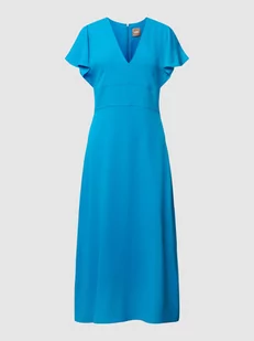 Sukienka midi damska BOSS;Mieszanka wiskozy i acetatu;Taliowany krój;Model ‘Dawinga’;Jednolity kolor;Dekolt w serek;Szerokie rękawy;Długość tyłu w rozmiarze 36: 120 cm;Szerokość klatki piersiowej w rozmiarze 36: 38 cm;Długość rękawa w rozmiarze 36: 17 cm