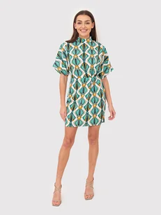 Sukienka mini z krótkim rękawem i kolorowym nadrukiem DA1758 MULTI Urocza sukienka mini z wysokim dekoltem z krótkim rękawem i nadrukiem.Posiada wysoki dekolt i zapięcie z tyłu. Materiał wykonania: 100% P ...