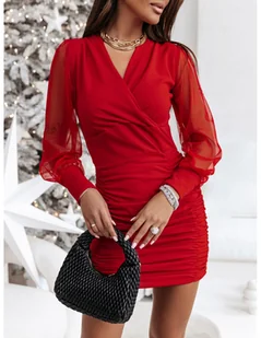 Sukienka mini z tiulowym rękawem COLINA - czerwona Przyciągnij spojrzenia w te święta, ubrana w naszą olśniewającą sukienkę! Ten stylowy model podkreśla Twoją kobiecość z każdego kąta: od elegancko wyprofilowanego, przekładanego dekoltu, po subtelne marszczenia, które dodają dynamiki i podkreślają Twoje kształty. Tiulowe rękawy dodają eterycznego uroku, a ich delikatna przezroczystość wprowadza nutę zmysłowości. Dopełnij swój look wybierając klasyczne, czarne szpilki i minimalistyczną kopertówkę, które pozwolą sukience pozostać gwiazdą zestawu. Złote lub srebrne biżuteryjne akcenty, takie jak delikatne bransoletki czy eleganckie kolczyki, subtelnie podkreślą szykowny charakter stylizacji, nie przytłaczając jej.