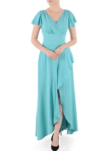 Zachwyć subtelną elegancją w sukience letniej, która łączy w sobie świeżość koloru turkusowego z niezobowiązującym fasonem. Ta sukienka na wesele czy komunię z rozkloszowanym, asymetrycznym dołem sprawi, że będziesz wyglądać olśniewająco, a jednocześnie czuć się swobodnie. Ozdobne zakładki i marszczenia wraz z gumą w pasie na plecach zapewniają perfekcyjne dopasowanie. Kopertowy dekolt i ozdobna falbana to detale, które dodadzą Twojemu wyglądowi wyrafinowanego charakteru, a krótkie rękawy są idealne na ciepłe, letnie dni. Ta elegancka sukienka to idealny wybór dla kobiety, która ceni sobie wyg