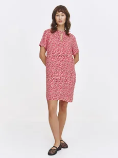 Sukienka damska Top Secret o pełnym luzu i prostoty fasonie. Ujmująca pełnym luzu oraz prostoty fasonem, jak i dużą wygodą podczas użytkowania, sukienka damska o długości do połowy uda z klasycznym krótkim rękawem zakończonym delikatnym przeszyciem. Posiada ona okrągły dekolt wzbogacony efektownym rozcięciem z przodu pośrodku biustu w kształcie przedłużonej łezki. Jest ona zapinana z tyłu na chowany suwak, będąc wykonaną z przewiewnej dzianiny wiskozowej, wzbogaconej na całości nadrukiem z motywem drobnych kwiatków. Będzie ona świetnym wyborem na niecodzienną stylizację wiosenną czy też wakacyjną.