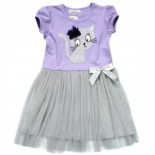 Sukienka tiulowa z kotkiem odcięta w pasie krótkie rękawki góra w liliowym odcieniu z przodu naszyty mieniący się KOTEK ozdobiony szyfonowym kwiatkiem dół w ...