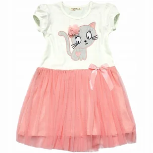 Sukienka tiulowa z kotkiem odcięta w pasie krótkie rękawki góra w śmietankowym odcieniu z przodu naszyty mieniący się KOTEK ozdobiony szyfonowym kwiatkiem dó...