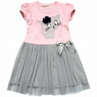 Sukienka tiulowa z kotkiem odcięta w pasie krótkie rękawki góra w jasnoróżowym odcieniu z przodu naszyty mieniący się KOTEK ozdobiony szyfonowym kwiatkiem dó...