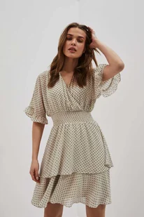 100%POLIESTER Urocza i dziewczęca sukienka, w kolorze beżowym. Na całości nadruk drobnych kropek. Kopertowy dekolt dodaje elegancji. Krótkie rękawy zakończon...