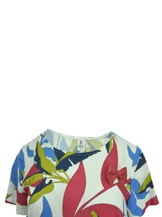 Sukienka z tkaniny drukowanej. Druk oczywiście autorski. Przód gładki z kieszeniami i 3D przypinka kokardką, na tyle w bogate falbany. Krótkie rękawki. Szyja z dekoltem okrągłym. Kieszenie w szwach. Przód l ...