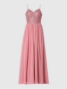 Sukienka wieczorowa damska LAONA;Szyfon;Taliowany krój;Hafty kwiatowe i ozdobne perełki;Dekolt w kształcie serca;Wąskie ramiączka;Rozkloszowana, wielowarstwowa spódnica;Drobne marszczenia;Dwa kolory;Nisko wszyte zapięcie na zamek błyskawiczny z tyłu;Długość tyłu w rozmiarze 36: 139 cm