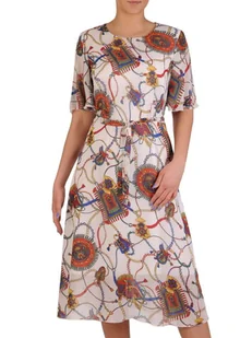 Odkryj piękno i wygodę, jaką oferuje ta wielokolorowa sukienka o rozkloszowanym fasonie, która zachwyca oryginalnym wzorem i dbałością o detale. Sukienka wyróżnia się delikatnym, lekkim szyfonem, który nadaje jej niezwykłej zwiewności i subtelności. Kolory, takie jak biały, chabrowy, czerwony, żółty, musztardowy oraz zielony, tworzą harmonijną kompozycję, idealnie pasującą do letnich stylizacji. Krótkie, rozszerzane rękawy dodają sukience lekkości, a przewiewny materiał zapewnia komfort noszenia nawet w cieplejsze dni. W talii znajduje się pasek, który podkreśla figurę i tworzy elegancką sylw