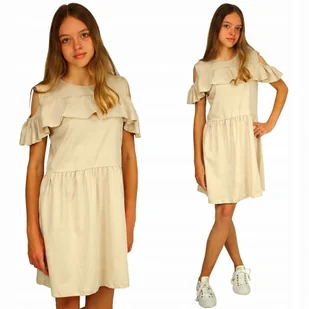 Efektowna sukienka z falbanką odcięta w pasie w odcieniu beżowym ozdobiona, naszytą wokół ramion, falbanką (hiszpanka) modnie wycięte ramiona dół lekko rozsz...