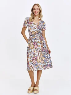 Sukienka damska Top Secret o pełnym swobody fasonie. Komfortowa podczas użytkowania, sukienka damska o pełnym luzu i swobody fasonie oraz długości za kolano. Posiada ona krótkie bufiaste rękawy zakończone luźną gumką oraz efektowny dekolt w serek wraz z ozdobną lamówką wokół, a uroku dodają jej szeroka gumka w talii, która podkreśla smukłość kobiecej sylwetki oraz wykonanie z delikatnej oraz przyjemnej w dotyku tkaniny wiskozowej. Została ona wzbogacona o barwny nadruk na całości z motywem orientalnym. Sukienka damska dostępna w kolorze niebieskim TSKL25SUK003455X00.