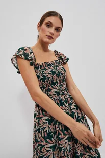 100%POLIESTER Sukienka w stylu boho, na całości zdobny nadruk liści, w kolorach zielonym i beżowym. Oryginalny, kwadratowy dekolt. Góra wykonana z marszczone...