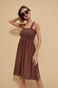 100%WISKOZA Niezwykle kobieca sukienka, z odkrytymi ramionami, na szerokich ramiączkach. Brązowy kolor. Górna część sukienki w formie ściągacza. Idealnie prz...