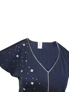 Sukienka lekko dopasowana, z mięsistej dzianiny w kolorze ciemnego granatu. Na przodzie aplikacja z srebrnych kulek i kamyków i skorki, oczywiście projekt autorski. Szczególną ozdobą jest srebrna wypus ...