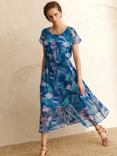 Kobieca i zwiewna sukienka Dagmara . W talii gumka, dół szeroki rozkloszowany. Na przędzie ozdobny wolant , wykończony srebrną wypustką. Dekolt okrągły, na tyle pęknięcie i wiązanie. Na dole na przodzie o ...