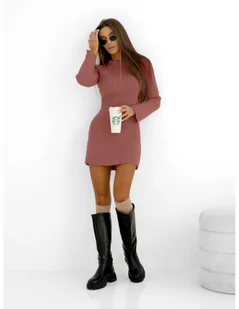 Sweterkowa mini sukienka NOVALIA - brudny róż Sweterkowa sukienka mini NOVALIA w pięknym odcieniu to idealna propozycja na chłodniejsze dni, gdy zależy Ci na wygodzie i stylu. Dopasowany krój podkreśla kobiece kształty, a prążkowana faktura dodaje jej nowoczesnego charakteru. Sukienka wykonana z miękkiej, elastycznej dzianiny zapewnia komfort przez cały dzień, a długość mini świetnie eksponuje nogi. To model, który doskonale sprawdzi się zarówno na co dzień, jak i na wieczorne wyjścia. Sweterkowa sukienka NOVALIA ma subtelnie rozkloszowany dół oraz delikatnie rozszerzane rękawy, co dodaje jej lekkości i elegancji.