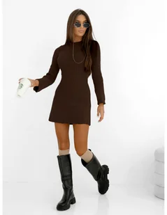 Sweterkowa mini sukienka NOVALIA - czekoladowa Sweterkowa sukienka mini NOVALIA w pięknym czekoladowym odcieniu to idealna propozycja na chłodniejsze dni, gdy zależy Ci na wygodzie i stylu. Dopasowany krój podkreśla kobiece kształty, a prążkowana faktura dodaje jej nowoczesnego charakteru. Sukienka wykonana z miękkiej, elastycznej dzianiny zapewnia komfort przez cały dzień, a długość mini świetnie eksponuje nogi. To model, który doskonale sprawdzi się zarówno na co dzień, jak i na wieczorne wyjścia. Sweterkowa sukienka NOVALIA ma subtelnie rozkloszowany dół oraz delikatnie rozszerzane rękawy, co dodaje jej lekkości i elegancji.