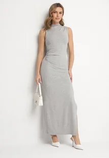 Szara Dopasowana Sukienka z Wełną Zdobiona Marszczeniem i Rozcięciem Lisarea