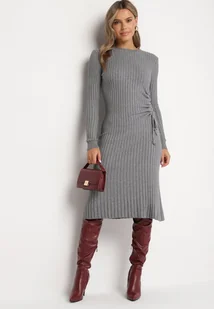 Szara Dopasowana Sukienka z Wiskozą z Prążkowanego Materiału Ściągana Troczkiem Eleavia