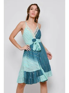 Sukienka w kolorze turkusowym - czysta wiskoza - ramiączka: regulowane - dekolt: V - talia: ściągacz tunelowy - detale: aplikacje - krój: taliowany - wzór: na całości