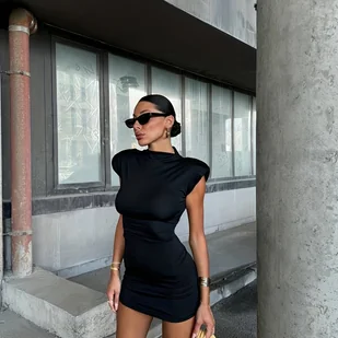 TEMU 1 szt. Retro Wielokolorowa Mini Sukienka Bodycon ze Stójką i Podkładkami na Ramiona Dopasowany Krój, Uniwersalna na Wszystkie Sezony, Idealna