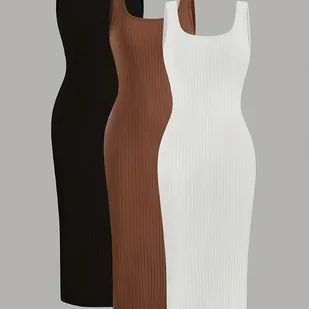TEMU 3 sztuki damskich, prążkowanych sukienek Bodycon - kwadratowy dekolt, długie rękawy, jednokolorowe (czarny, brązowy, biały) - eleganckie i