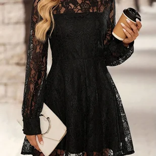 TEMU Czarna koronkowa, dopasowana sukienka na krótko z długim rękawem, stylowy i elegancki strój formalny dla kobiet na jesień.