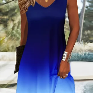 TEMU Damska sukienka gradientowa w kolorze niebieskim z dekoltem w szpic - krótki rękaw, rozciągliwa mieszanka poliestru, nadająca się do prania w