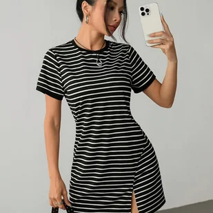 TEMU Damska Sukienka Krótki Rękaw w Paski z Rozcięciem - Okrągły Dekolt, Letnia Sukienka na Plażę, Karnawał i Codzienne Stylizacje - Pranie w Praniu