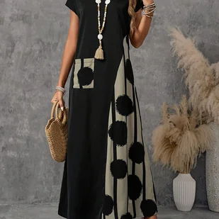TEMU Dziewczęca letnia sukienka z luźnym krojem - geometryczny wzór, okrągły dekolt, krótki rękaw, sylwetka w kształcie litery A z kieszeniami,