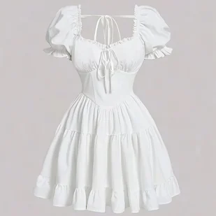 TEMU Dziewczęca letnia sukienka z wycięciem w kształcie litery V, urocza jednokolorowa sukienka z falbankami i pufkami, lekka tkanina o masie 120